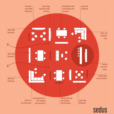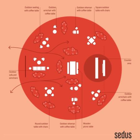 GARDENs are designed for well-being and relaxed work, offering a calm and natural atmosphere, inspired by the concept of bringing the outdoors inside and vice versa. It features abundant greenery, with plants and other natural elements. The layout is highly organic, with many diverse furniture pieces such as outdoor tables, soft seating areas, and isolated retreats with single armchairs and coffee tables. The bar counter, while present, is placed to the side, maintaining the focus on relaxation and nature. This setup supports well-being and allows individuals to engage in all the activities: collaboration, communication, concentration, and contemplation in a relaxed environment.